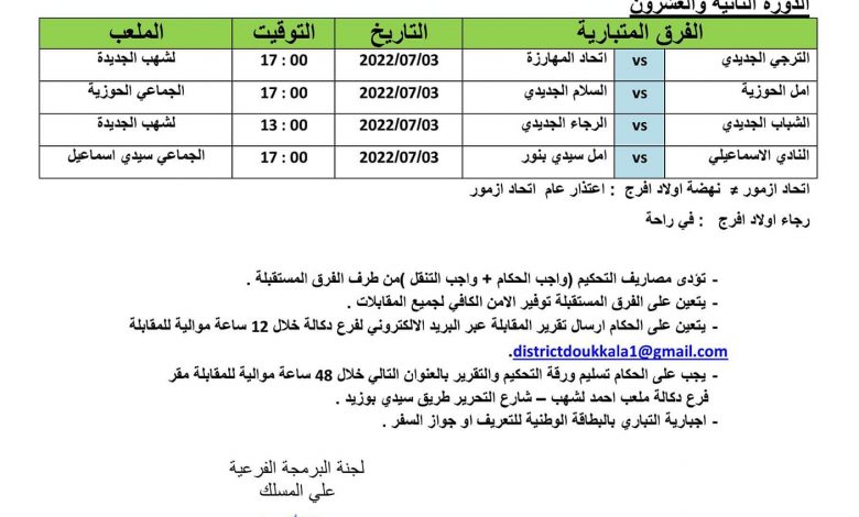 برنامج الدورة الثانية و العشرون من البطولة الفرعية لدكالة فئة الشبان الموسم 2021/2022.