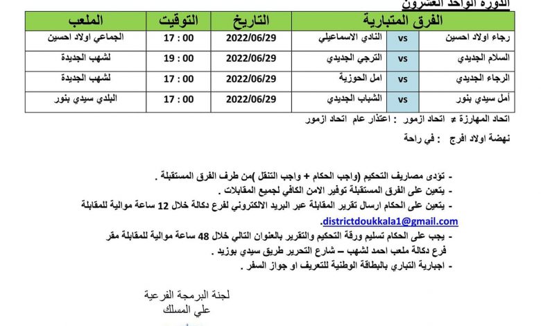 برنامج الدورة الواحد و العشرون للبطولة الفرعية لدكالة فئة الشبان عن الموسم 2021/2022