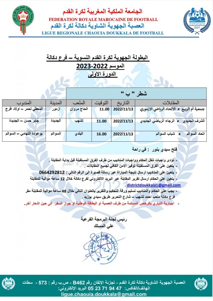 برنامج الدورة الأولى من البطولة الجهوية لكرة القدم النسوية فرع دكالة