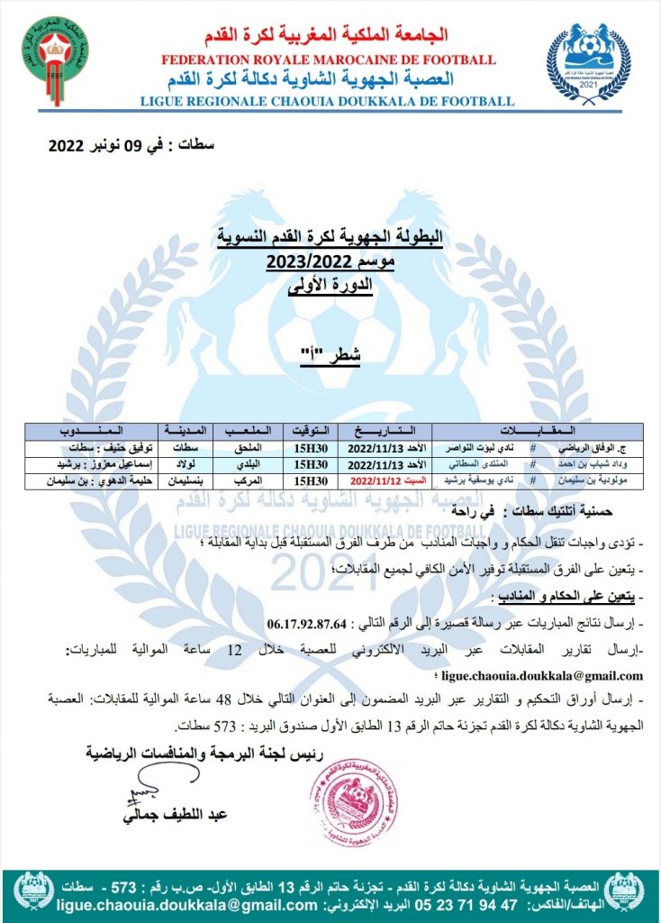 برنامج الدورة الأولى من البطولة الجهوية لكرة القدم النسوية فرع الشاوية