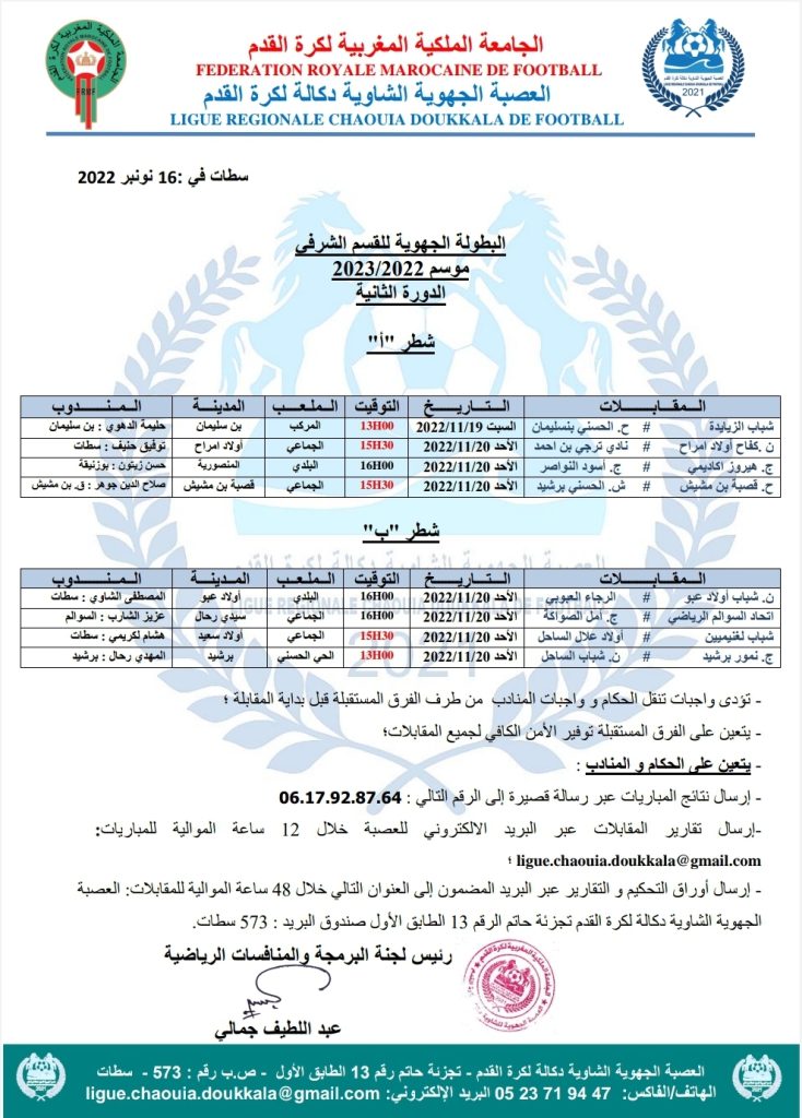 برنامج الدورة الثانية لبطولة القسم الشرفي – فرع الشاوية