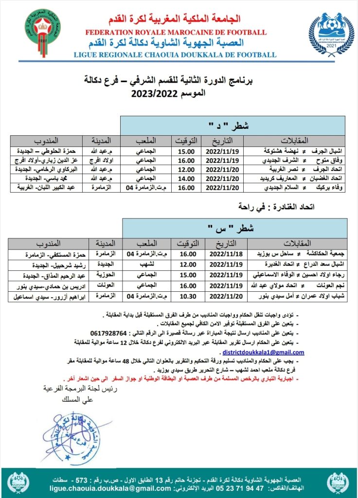 برنامج الدورة الثانية لبطولة القسم الشرفي – فرع دكالة