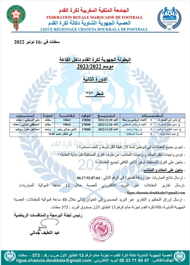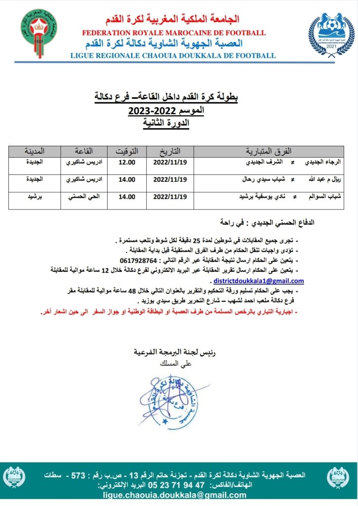 برنامج الدورة الثانية من البطولة الجهوية لكرة القدم داخل القاعة - فرع الشاوية برنامج الدورة الثانية من البطولة الجهوية لكرة القدم داخل القاعة - فرع دكالة