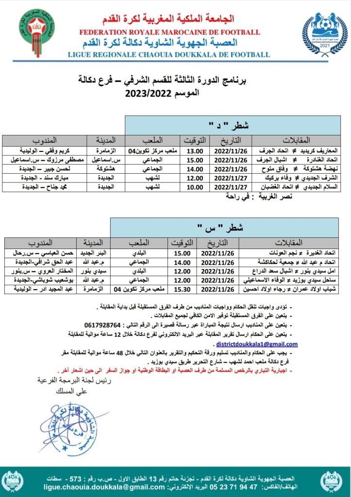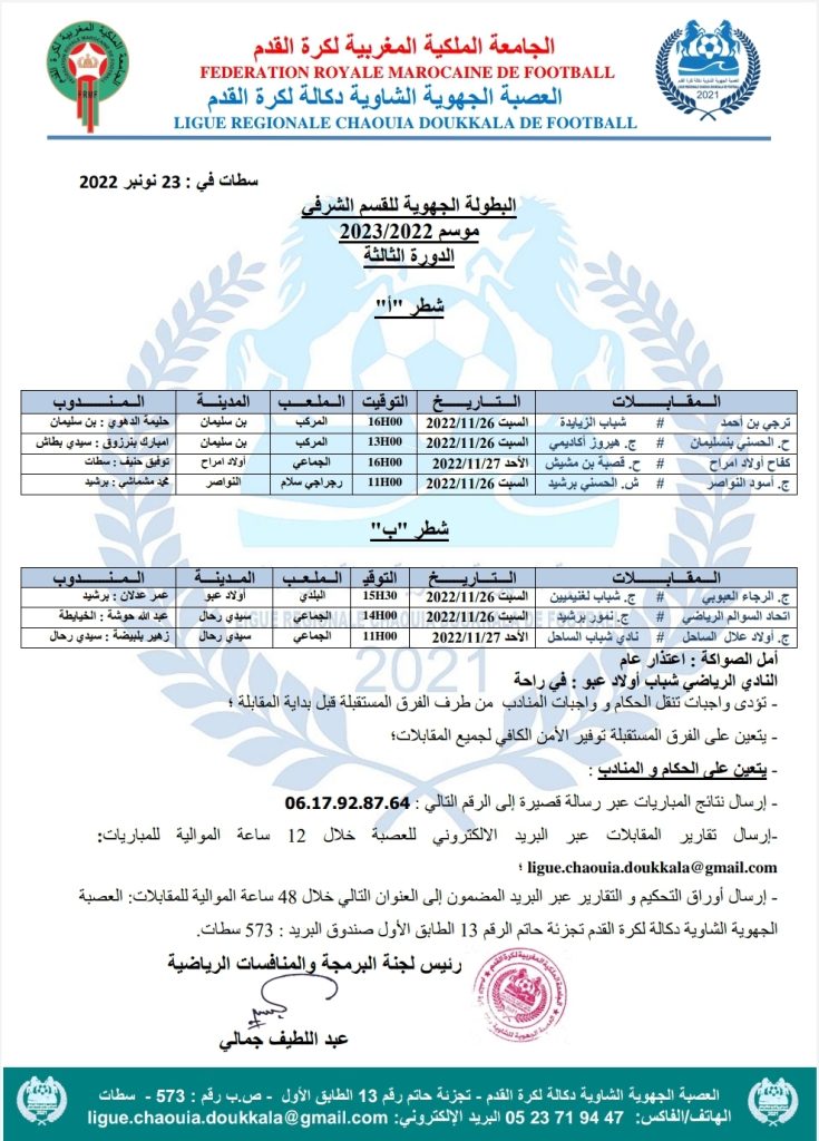 الرئيسية/مسابقات/1- بطولات العصبة الجهوية/برنامج الدورة الثالثة من البطولة الجهوية القسم الشرفي 1- بطولات العصبة الجهوية برنامج الدورة الثالثة من البطولة الجهوية القسم الشرفي نوفمبر 23, 2022 168 فيسبوك تويتر واتساب تيلقرام مشاركة عبر البريد طباعة فرع الشاوية فرع دكالة نوفمبر 23, 2022 168 فيسبوك تويتر واتساب تيلقرام مشاركة عبر البريد طباعة اظهر المزيد شاركها فيسبوك تويتر واتساب تيلقرام مشاركة عبر البريد طباعة