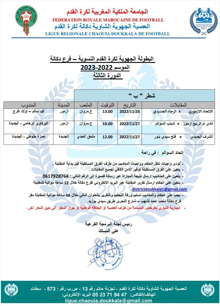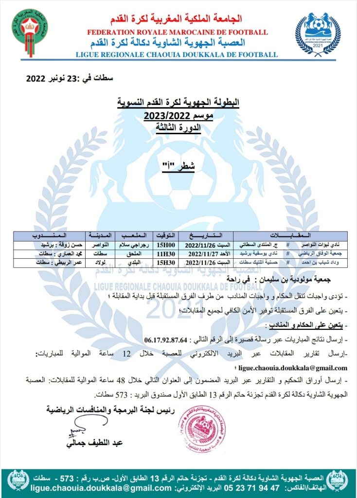الرئيسية/مسابقات/5- كرة القدم النسوية/برنامج الدورة الثالثة من البطولة الجهوية لكرة القدم النسوية 5- كرة القدم النسوية برنامج الدورة الثالثة من البطولة الجهوية لكرة القدم النسوية نوفمبر 23, 2022 157 فيسبوك تويتر واتساب تيلقرام مشاركة عبر البريد طباعة فرع الشاوية فرع دكالة نوفمبر 23, 2022 157 فيسبوك تويتر واتساب تيلقرام مشاركة عبر البريد طباعة اظهر المزيد شاركها فيسبوك تويتر واتساب تيلقرام مشاركة عبر البريد طباعة