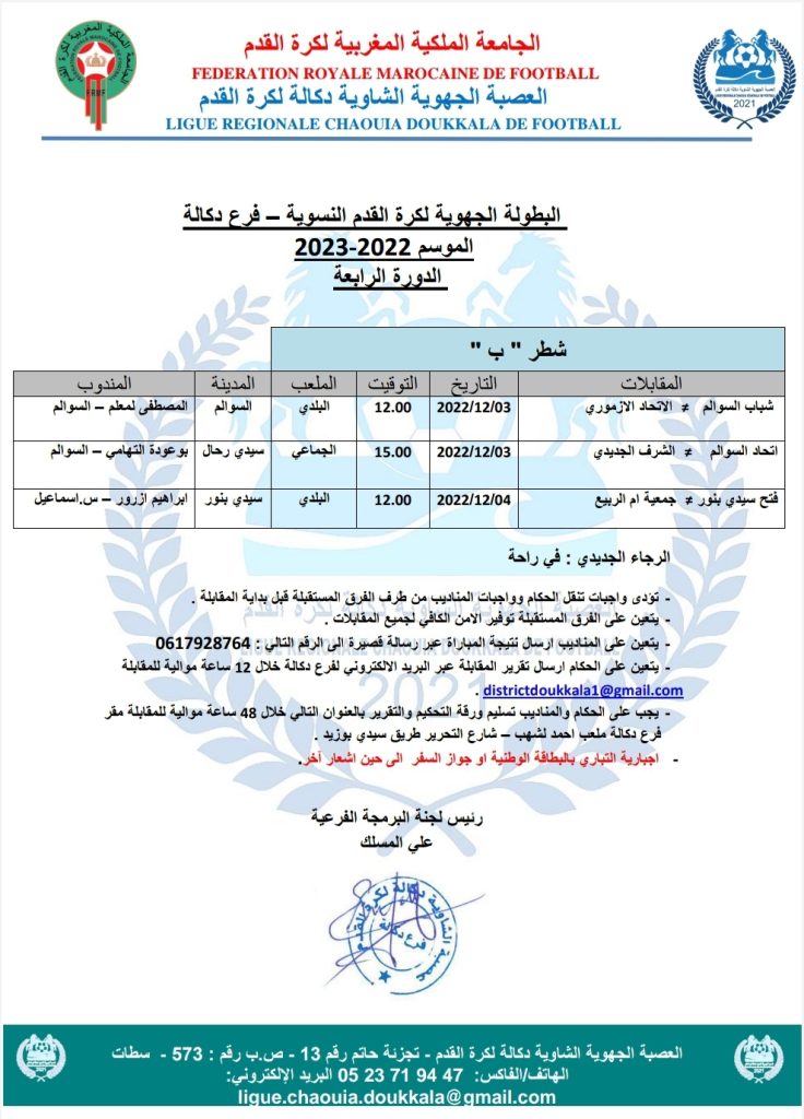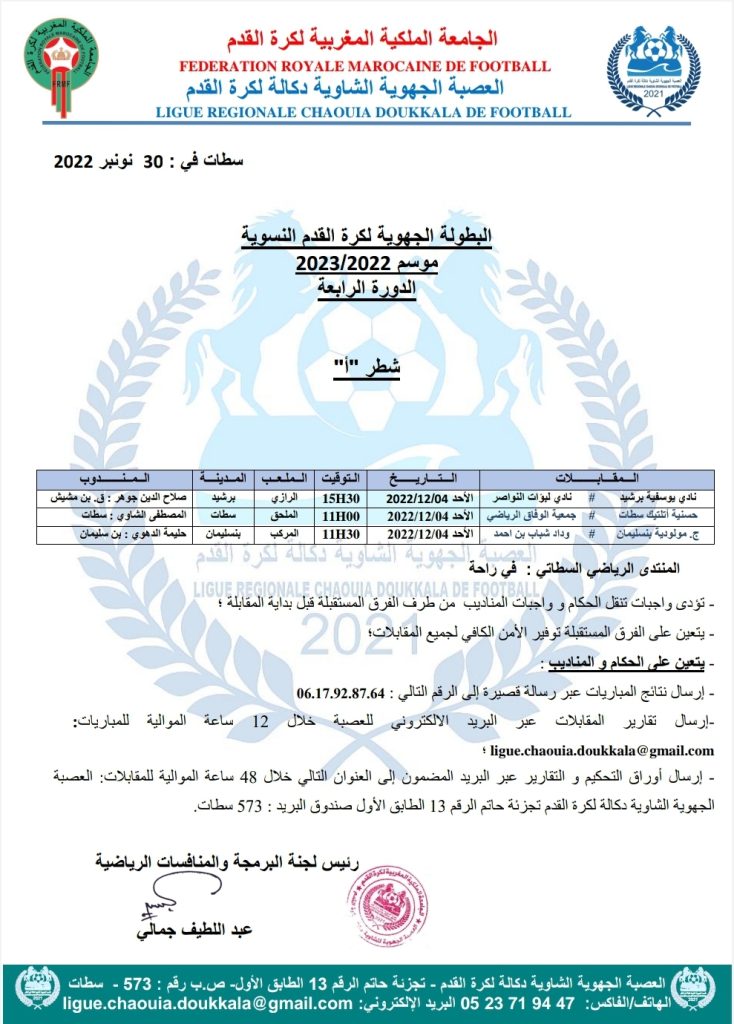 الرئيسية/مسابقات/5- كرة القدم النسوية/برنامج الدورة الرابعة من البطولة الجهوية لكرة القدم النسوية 5- كرة القدم النسوية برنامج الدورة الرابعة من البطولة الجهوية لكرة القدم النسوية نوفمبر 30, 2022 155 فيسبوك تويتر واتساب تيلقرام مشاركة عبر البريد طباعة فرع الشاوية فرع دكالة نوفمبر 30, 2022 155 فيسبوك تويتر واتساب تيلقرام مشاركة عبر البريد طباعة اظهر المزيد شاركها فيسبوك تويتر واتساب تيلقرام مشاركة عبر البريد طباعة