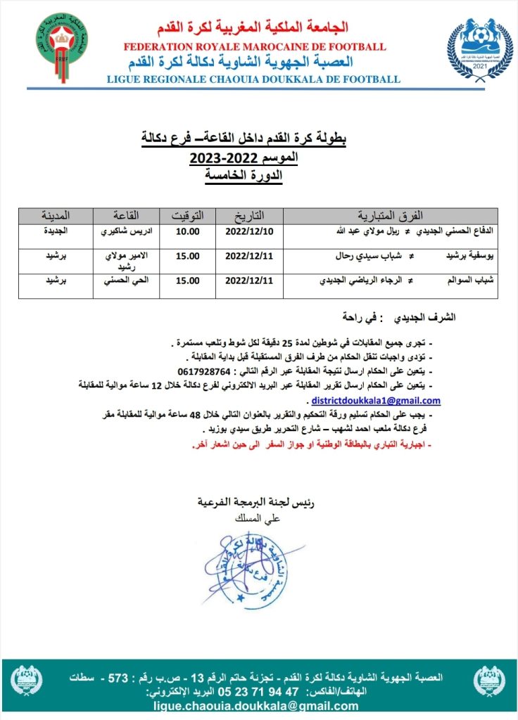 الرئيسية/رياضات متنوعة/1- كرة القدم داخل القاعة/برنامج الدورة الخامسة من البطولة الجهوية لكرة القدم داخل القاعة – فرع دكالة 1- كرة القدم داخل القاعة برنامج الدورة الخامسة من البطولة الجهوية لكرة القدم داخل القاعة – فرع دكالة ديسمبر 7, 2022 177 فيسبوك تويتر واتساب تيلقرام مشاركة عبر البريد طباعة فرع دكالة ديسمبر 7, 2022 177 فيسبوك تويتر واتساب تيلقرام مشاركة عبر البريد طباعة اظهر المزيد شاركها فيسبوك تويتر واتساب تيلقرام مشاركة عبر البريد طباعة