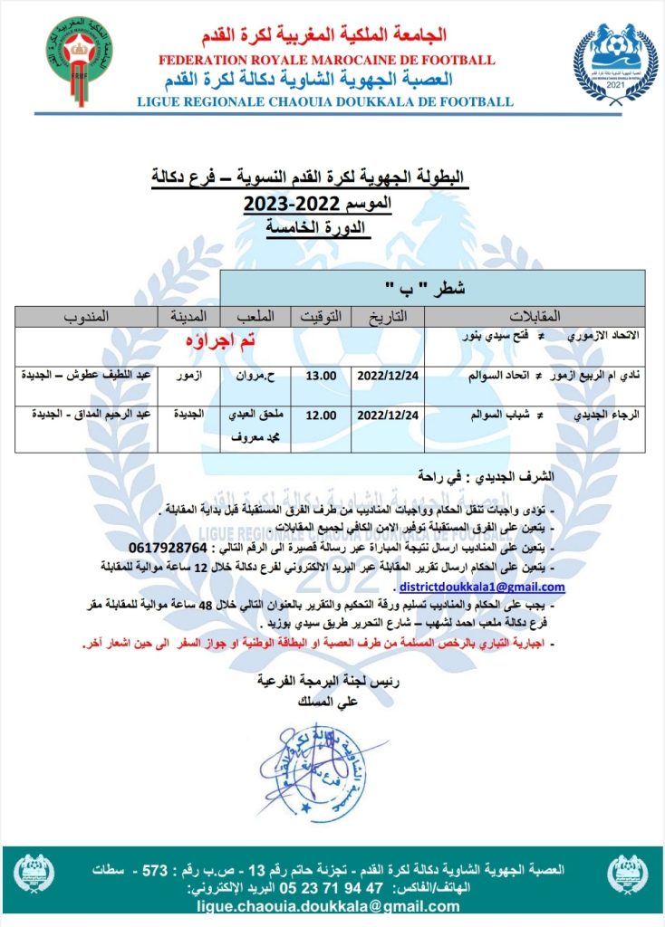 الرئيسية/مسابقات/5- كرة القدم النسوية/برنامج الدورة الخامسة من البطولة الجهوية لكرة القدم النسوية – فرع دكالة 5- كرة القدم النسوية برنامج الدورة الخامسة من البطولة الجهوية لكرة القدم النسوية – فرع دكالة ديسمبر 21, 2022 197 فيسبوك تويتر واتساب تيلقرام مشاركة عبر البريد طباعة ديسمبر 21, 2022 197 فيسبوك تويتر واتساب تيلقرام مشاركة عبر البريد طباعة اظهر المزيد شاركها فيسبوك تويتر واتساب تيلقرام مشاركة عبر البريد طباعة