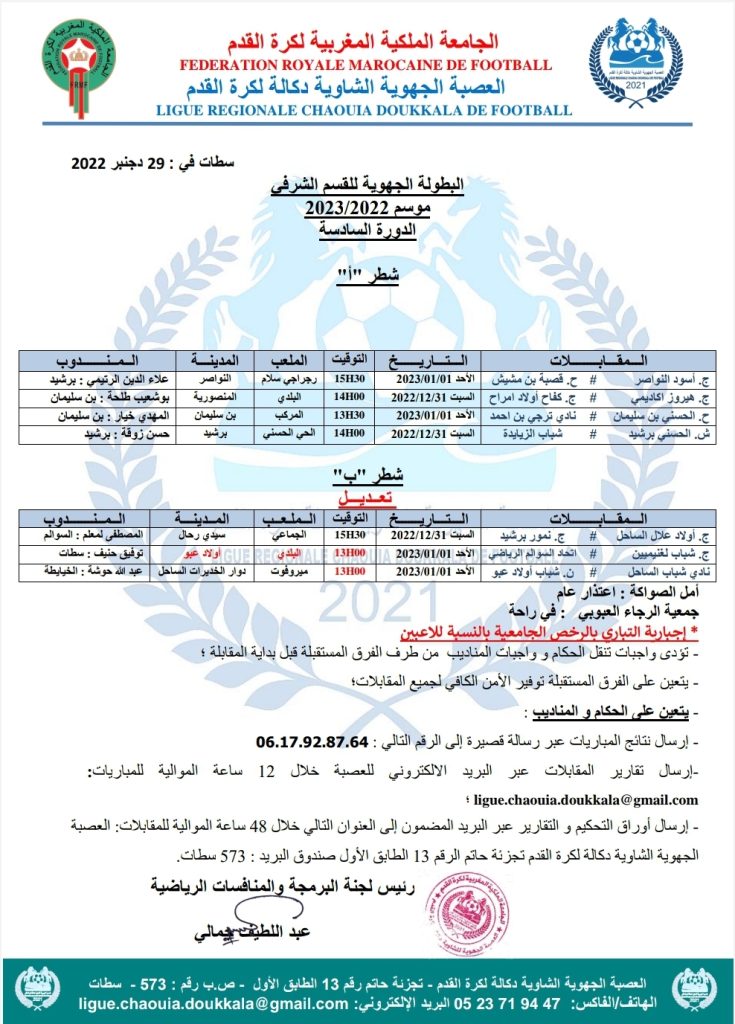 تعديل في برنامج الدورة السادسة من البطولة الجهوية القسم الشرفي – فرع الشاوية