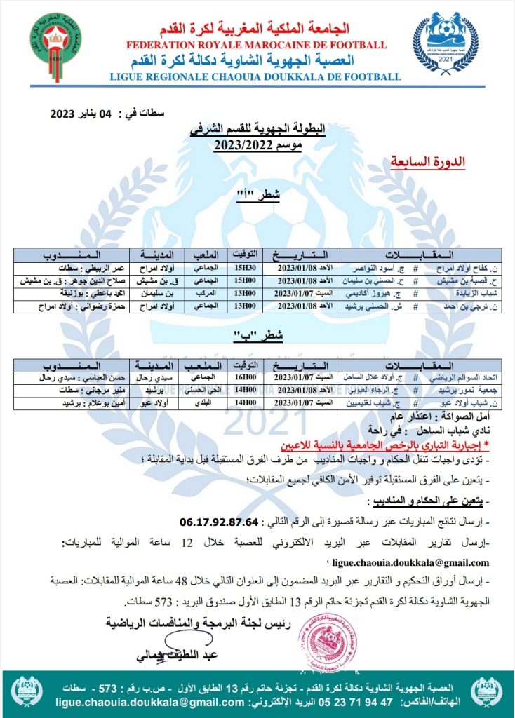 الرئيسية/مسابقات/1- بطولات العصبة الجهوية/برنامج الدورة السابعة من البطولة الجهوية القسم الشرفي 1- بطولات العصبة الجهوية برنامج الدورة السابعة من البطولة الجهوية القسم الشرفي يناير 4, 2023 144 فيسبوك تويتر واتساب تيلقرام مشاركة عبر البريد طباعة يناير 4, 2023 144 فيسبوك تويتر واتساب تيلقرام مشاركة عبر البريد طباعة اظهر المزيد شاركها فيسبوك تويتر واتساب تيلقرام مشاركة عبر البريد طباعة