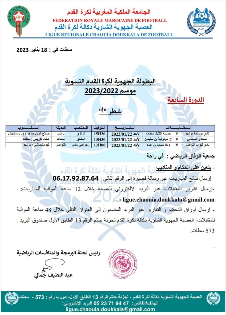 برنامج الدورة السابعة من البطولة الجهوية لكرة القدم النسوية-فرع الشاوية