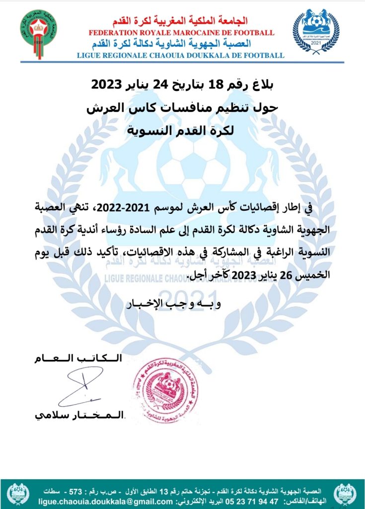 الرئيسية/بلاغات و دوريات و محاضر/بلاغات العصبة/بلاغ رقم 18 بتاريخ 24 يناير 2023 حول تنظيم منافسات كاس العرش لكرة القدم النسوية بلاغات العصبة بلاغ رقم 18 بتاريخ 24 يناير 2023 حول تنظيم منافسات كاس العرش لكرة القدم النسوية يناير 24, 2023 127 فيسبوك تويتر واتساب تيلقرام مشاركة عبر البريد طباعة يناير 24, 2023 127 فيسبوك تويتر واتساب تيلقرام مشاركة عبر البريد طباعة اظهر المزيد شاركها فيسبوك تويتر واتساب تيلقرام مشاركة عبر البريد طباعة