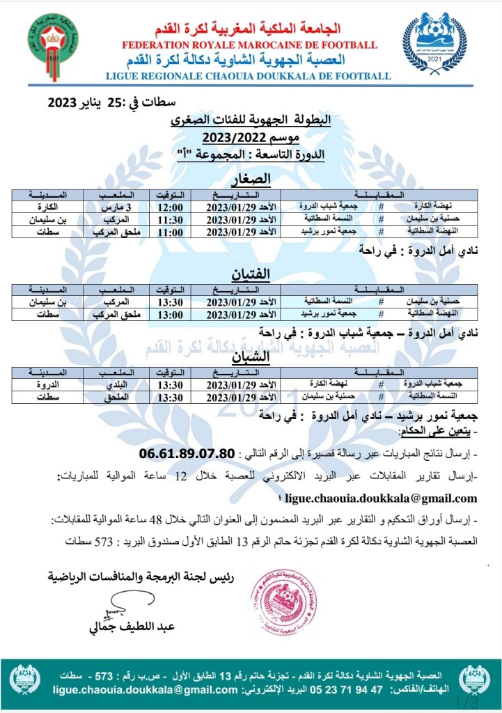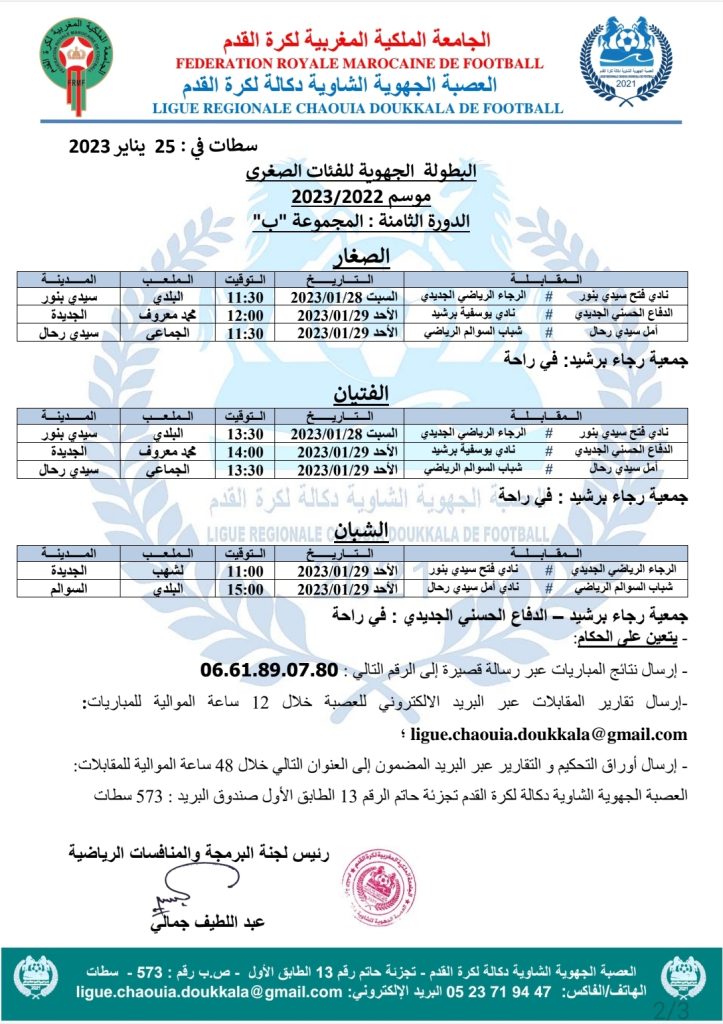 الرئيسية/مسابقات/2- بطولات الفئات العمرية/برنامج البطولة الجهوية للفئات الصغرى 2- بطولات الفئات العمرية برنامج البطولة الجهوية للفئات الصغرى يناير 25, 2023 176 فيسبوك تويتر واتساب تيلقرام مشاركة عبر البريد طباعة يناير 25, 2023 176 فيسبوك تويتر واتساب تيلقرام مشاركة عبر البريد طباعة اظهر المزيد شاركها فيسبوك تويتر واتساب تيلقرام مشاركة عبر البريد طباعة