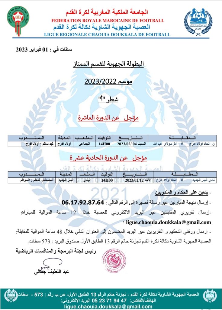 الرئيسية/مسابقات/1- بطولات العصبة الجهوية/برنامج مؤجلات البطولة الجهوية القسم الممتاز 1- بطولات العصبة الجهوية برنامج مؤجلات البطولة الجهوية القسم الممتاز فبراير 2, 2023 177 فيسبوك تويتر واتساب تيلقرام مشاركة عبر البريد طباعة فبراير 2, 2023 177 فيسبوك تويتر واتساب تيلقرام مشاركة عبر البريد طباعة اظهر المزيد شاركها فيسبوك تويتر واتساب تيلقرام مشاركة عبر البريد طباعة