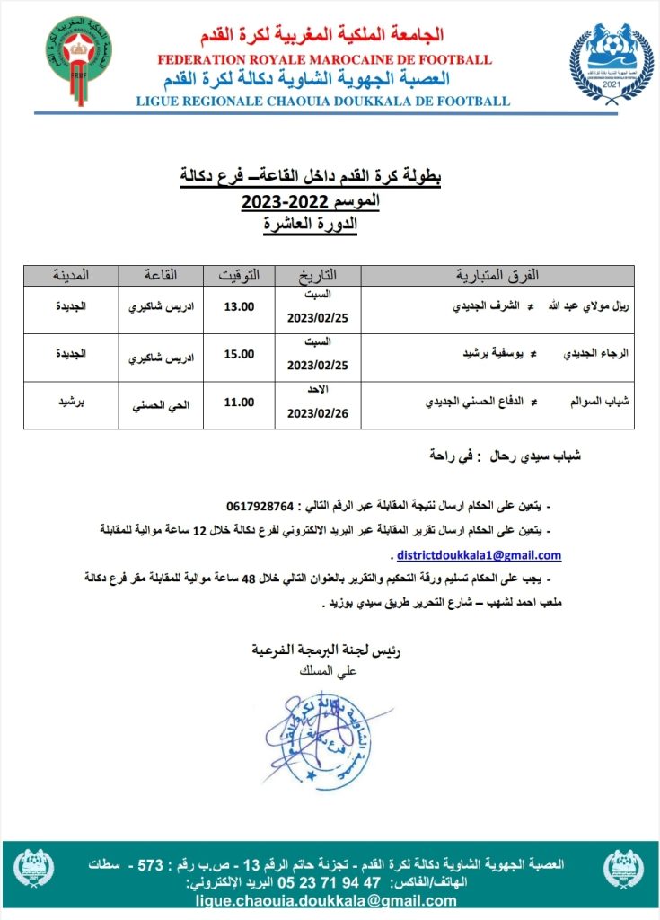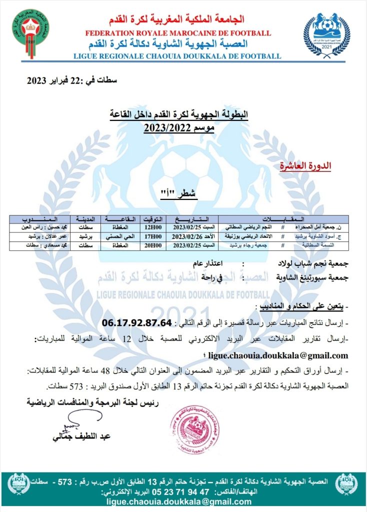الرئيسية/مسابقات/1- بطولات العصبة الجهوية/برنامج الدورة العاشرة من البطولة الجهوية لكرة القدم داخل القاعة 1- بطولات العصبة الجهوية برنامج الدورة العاشرة من البطولة الجهوية لكرة القدم داخل القاعة فبراير 22, 2023 132 فيسبوك تويتر واتساب تيلقرام مشاركة عبر البريد طباعة فبراير 22, 2023 132 فيسبوك تويتر واتساب تيلقرام مشاركة عبر البريد طباعة اظهر المزيد شاركها فيسبوك تويتر واتساب تيلقرام مشاركة عبر البريد طباعة
