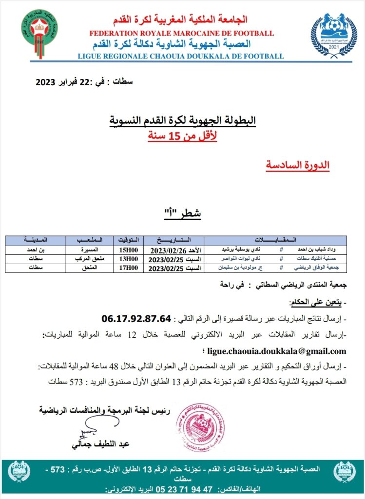 الرئيسية/مسابقات/2- بطولات الفئات العمرية/برنامج البطولة الجهوية لكرة القدم النسوية لأقل من 15 سنة (فرع الشاوية) 2- بطولات الفئات العمرية برنامج البطولة الجهوية لكرة القدم النسوية لأقل من 15 سنة (فرع الشاوية) فبراير 22, 2023 237 فيسبوك تويتر واتساب تيلقرام مشاركة عبر البريد طباعة فبراير 22, 2023 237 فيسبوك تويتر واتساب تيلقرام مشاركة عبر البريد طباعة اظهر المزيد شاركها فيسبوك تويتر واتساب تيلقرام مشاركة عبر البريد طباعة