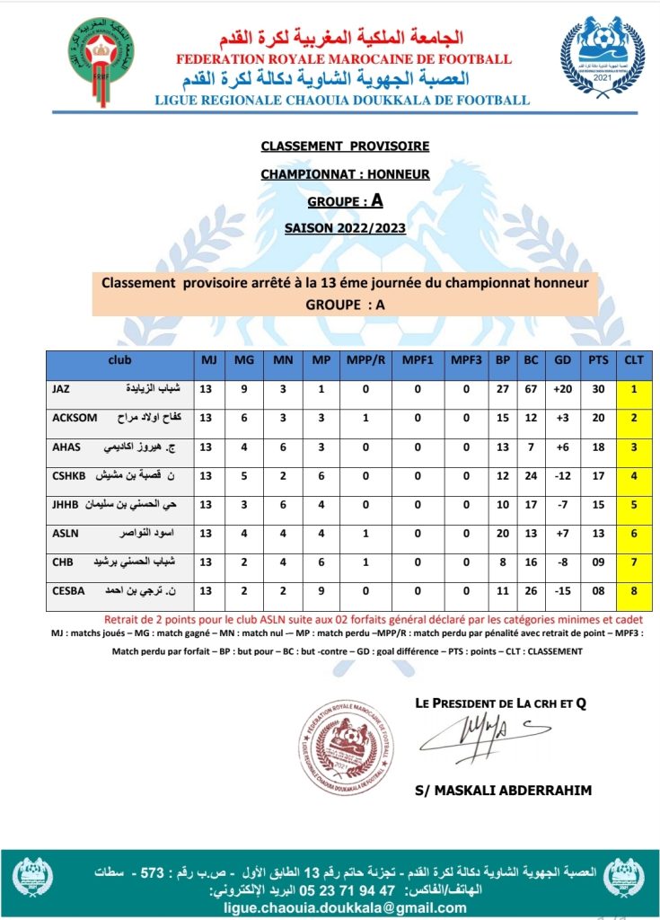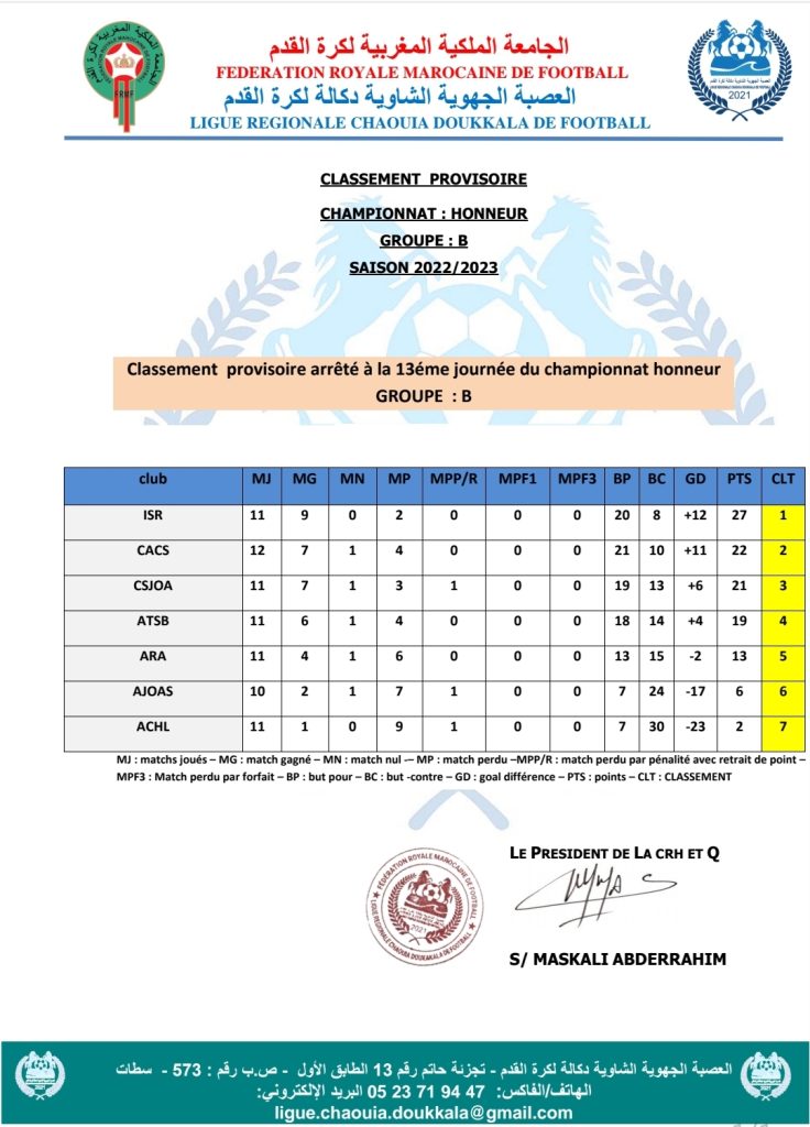 الترتيب المؤقت للبطولة الجهوية لكرة القسم الشرفي – فرع الشاوية