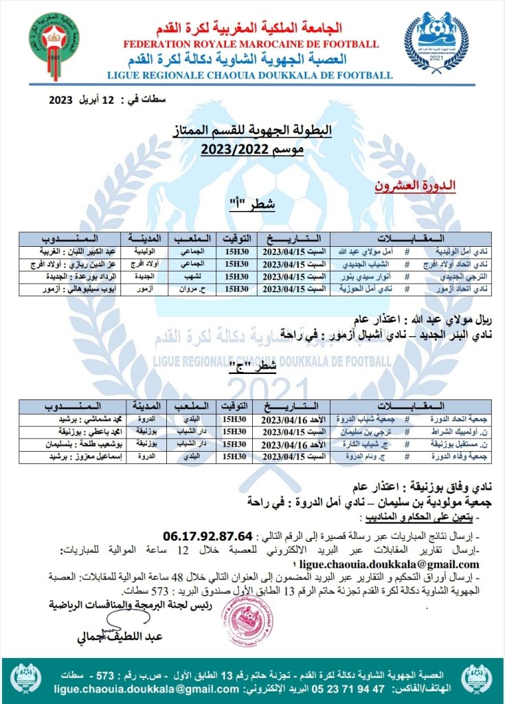 الرئيسية/مسابقات/1- بطولات العصبة الجهوية/برنامج الدورة العشرون من البطولة الجهوية القسم الممتاز 1- بطولات العصبة الجهوية برنامج الدورة العشرون من البطولة الجهوية القسم الممتاز أبريل 12, 2023 301 فيسبوك تويتر واتساب تيلقرام مشاركة عبر البريد طباعة أبريل 12, 2023 301 فيسبوك تويتر واتساب تيلقرام مشاركة عبر البريد طباعة اظهر المزيد شاركها فيسبوك تويتر واتساب تيلقرام مشاركة عبر البريد طباعة