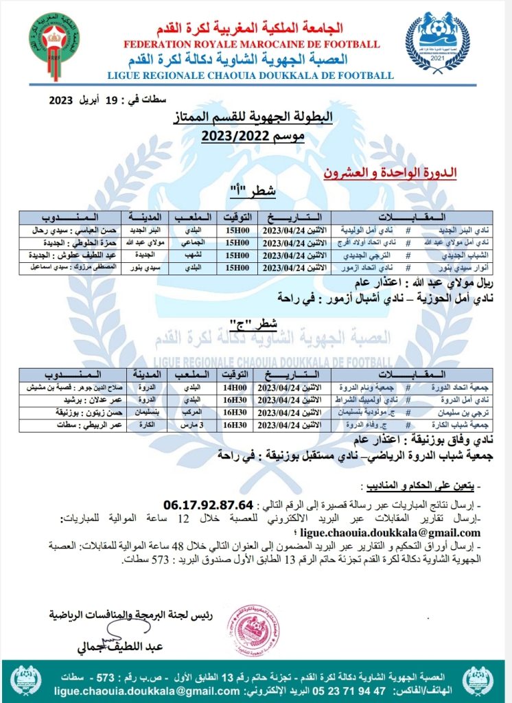 الرئيسية/مسابقات/1- بطولات العصبة الجهوية/برنامج الدورة الواحدة و العشرون من البطولة الجهوية القسم الممتاز 1- بطولات العصبة الجهوية برنامج الدورة الواحدة و العشرون من البطولة الجهوية القسم الممتاز أبريل 19, 2023 364 فيسبوك تويتر واتساب تيلقرام مشاركة عبر البريد طباعة أبريل 19, 2023 364 فيسبوك تويتر واتساب تيلقرام مشاركة عبر البريد طباعة اظهر المزيد شاركها فيسبوك تويتر واتساب تيلقرام مشاركة عبر البريد طباعة