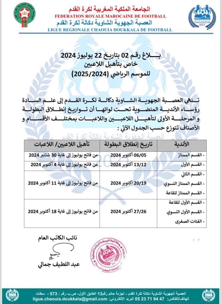 الرئيسية/بلاغات و دوريات و محاضر/بلاغات العصبة/بلاغ رقم 02 بتاريخ 22 يوليوز 2024 خاص بتأهيل اللاعبين بلاغات العصبة بلاغ رقم 02 بتاريخ 22 يوليوز 2024 خاص بتأهيل اللاعبين يوليو 22, 2024 124 فيسبوك تويتر واتساب تيلقرام مشاركة عبر البريد طباعة يوليو 22, 2024 124 فيسبوك تويتر واتساب تيلقرام مشاركة عبر البريد طباعة اظهر المزيد شاركها فيسبوك تويتر واتساب تيلقرام مشاركة عبر البريد طباعة
