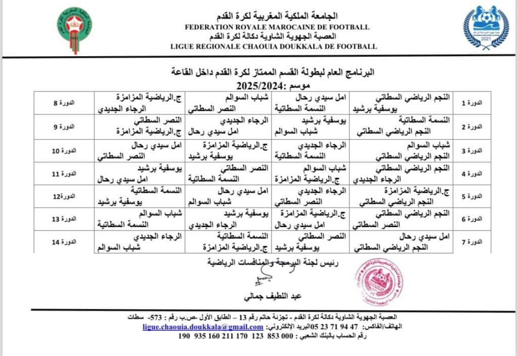 الرئيسية/مسابقات/1- بطولات العصبة الجهوية/البرنامج العام لبطولة القسم الممتاز لكرة القدم داخل القاعة للموسم الرياضي 2025/2024 1- بطولات العصبة الجهوية البرنامج العام لبطولة القسم الممتاز لكرة القدم داخل القاعة للموسم الرياضي 2025/2024 أكتوبر 16, 2024 192 فيسبوك تويتر واتساب تيلقرام مشاركة عبر البريد طباعة أكتوبر 16, 2024 192 فيسبوك تويتر واتساب تيلقرام مشاركة عبر البريد طباعة اظهر المزيد شاركها فيسبوك تويتر واتساب تيلقرام مشاركة عبر البريد طباعة
