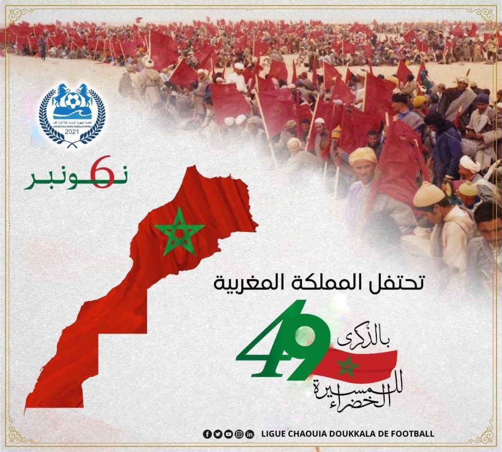 يتقدم المكتب المديري للعصبة الجهوية الشاوية دكالة بخالص التهاني لصاحب الجلالة الملك محمد السادس و للشعب المغربي عامة بحلول الذكرى 49 للمسيرة الخضراء المظفرة و الملحمة الوطنية الخالدة 🇲🇦