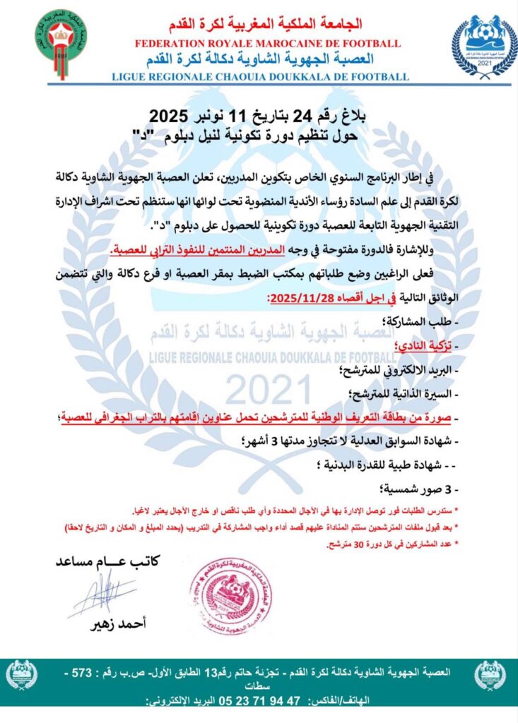 بلاغ رقم 24 بتاريخ 11 نونبر 2025 حول تنظيم دورة تكوينية لنيل دبلوم “د”