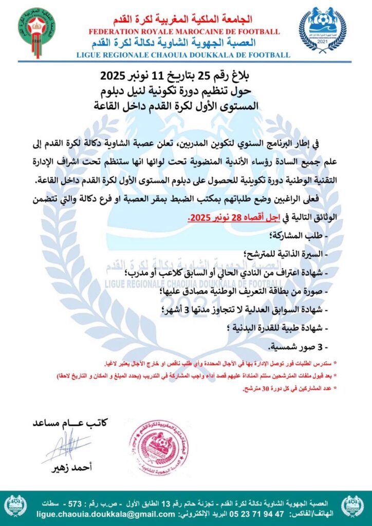 بلاغ رقم 25 بتاريخ 11 نونبر 2025 حول تنظيم دورة تكوينية لنيل دبلوم المستوى الأول لكرة القدم داخل القاعة