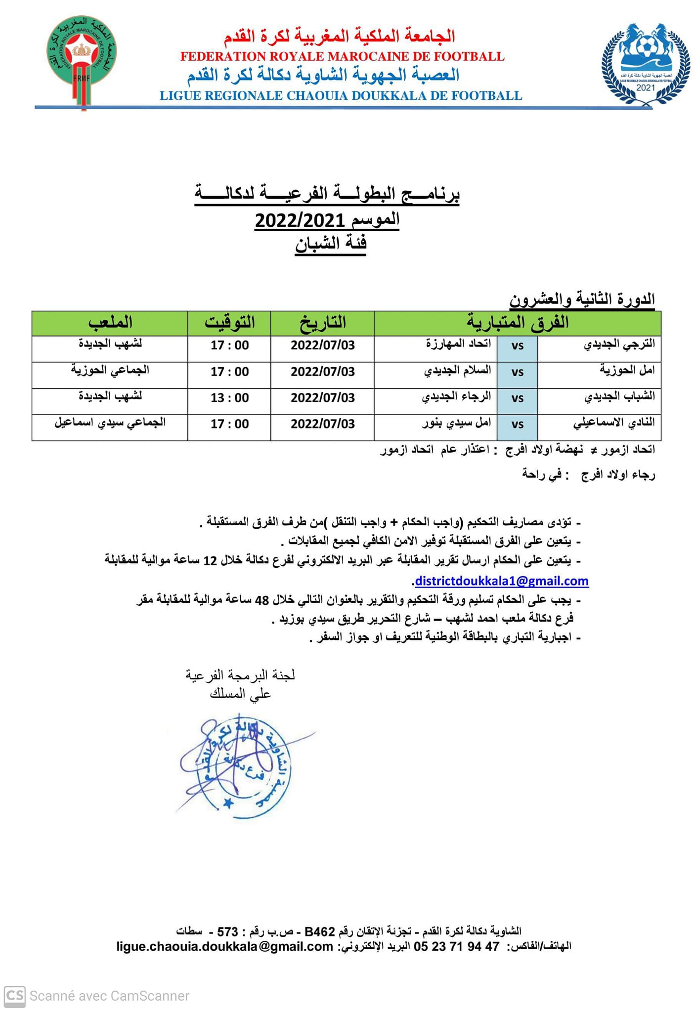 برنامج الدورة الثانية و العشرون من البطولة الفرعية لدكالة فئة الشبان الموسم 2021/2022.
